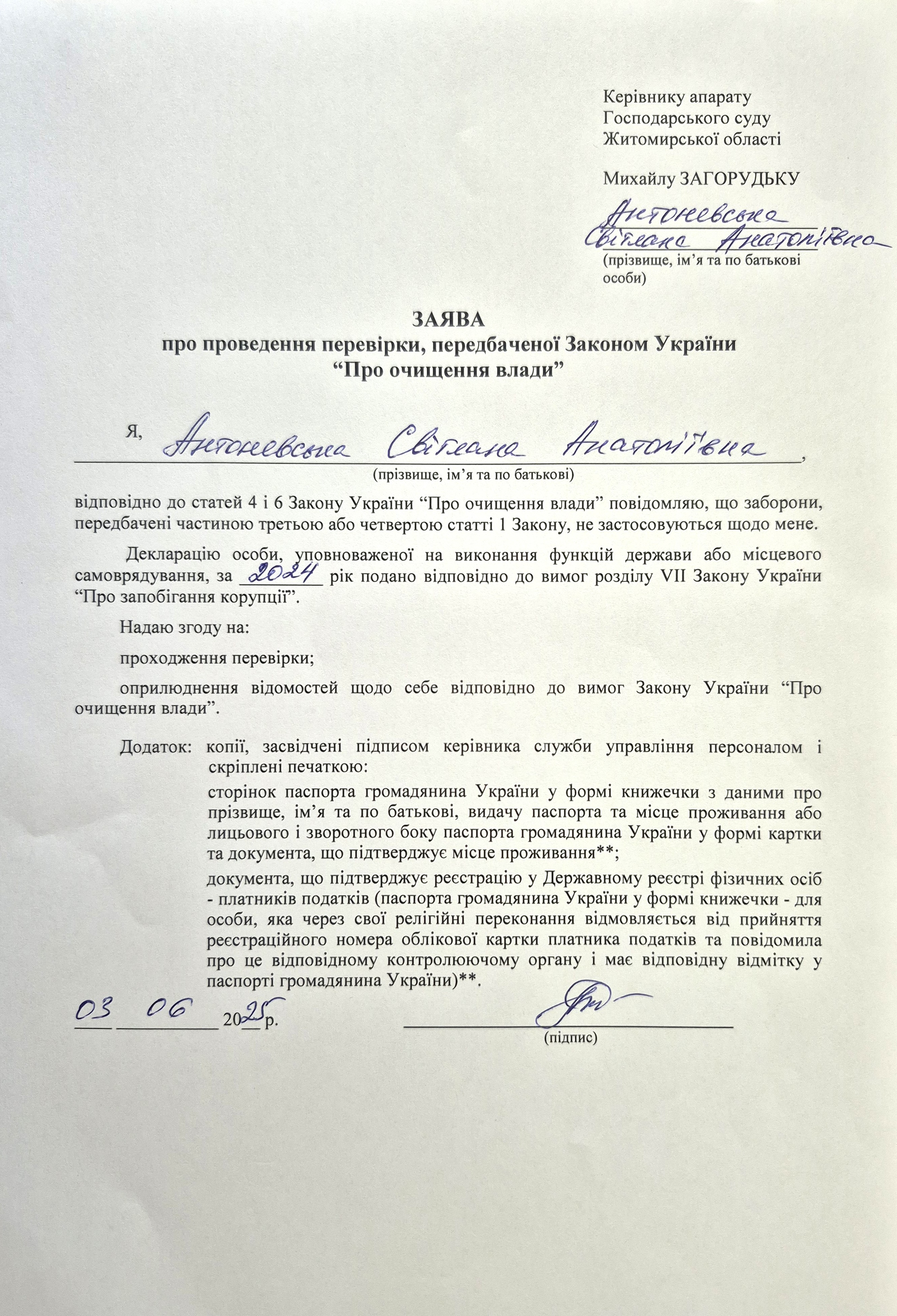 02 червня 2025 року у Господарському суді Житомирської області розпочато перевірку, передбачену Законом України «Про очищення влади», щодо головного спеціаліста Сектору архіву загального відділу (канцелярії) Господарського суду Житомирської області - Антоневської Світлани, призначеної на посаду у період дії воєнного стану.