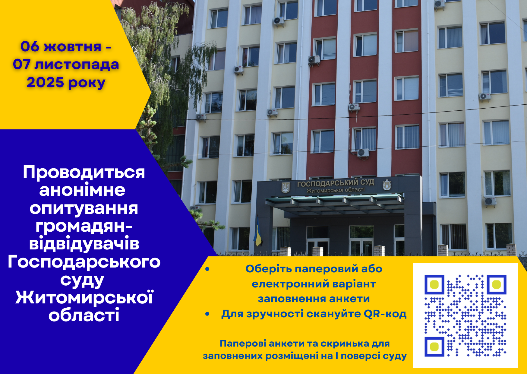 Мета опитування - отримати відгуки, пропозиції, зауваження та скарги щодо діяльності суду та врахувати їх для поліпшення організаційної роботи Господарського суду Житомирської області.