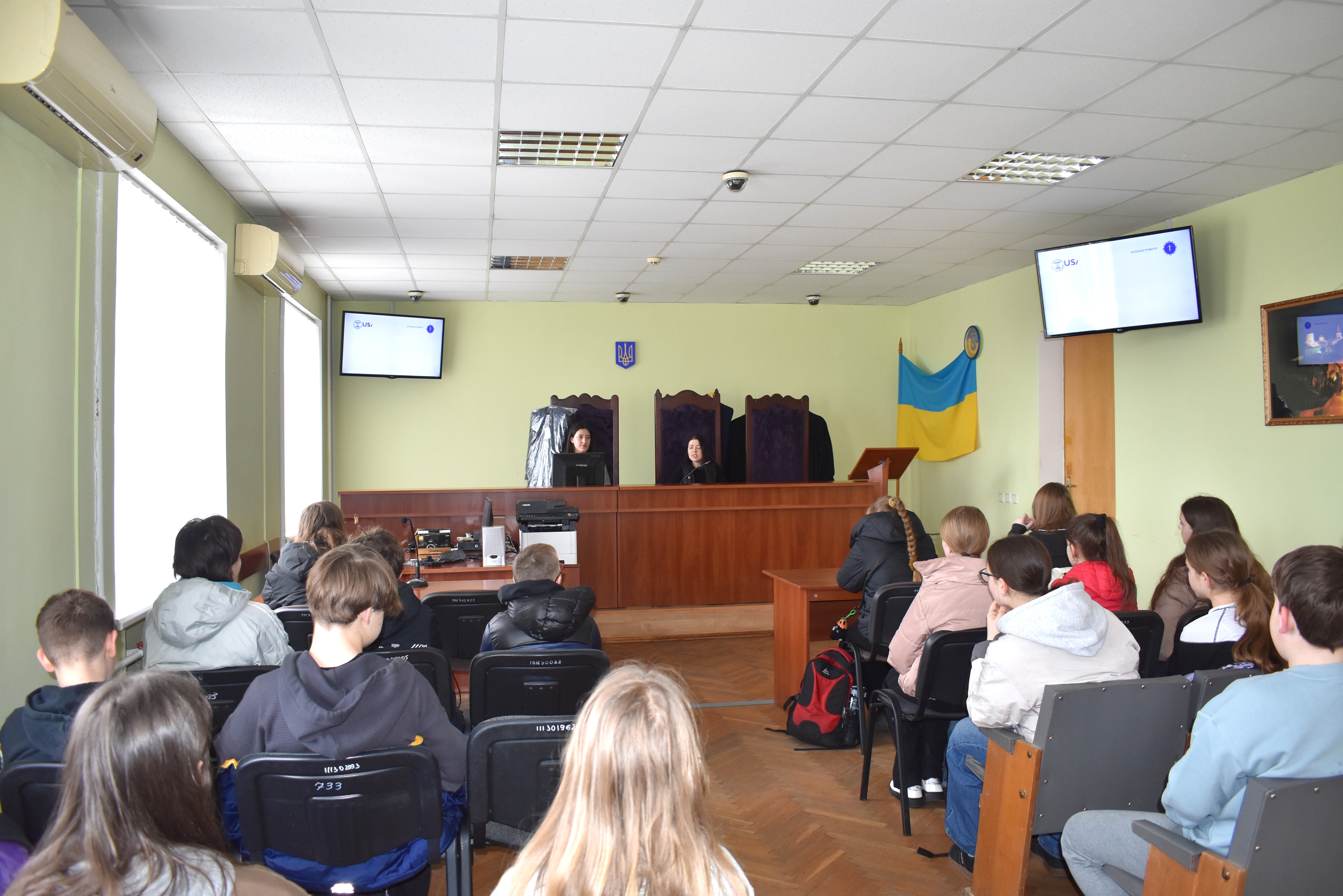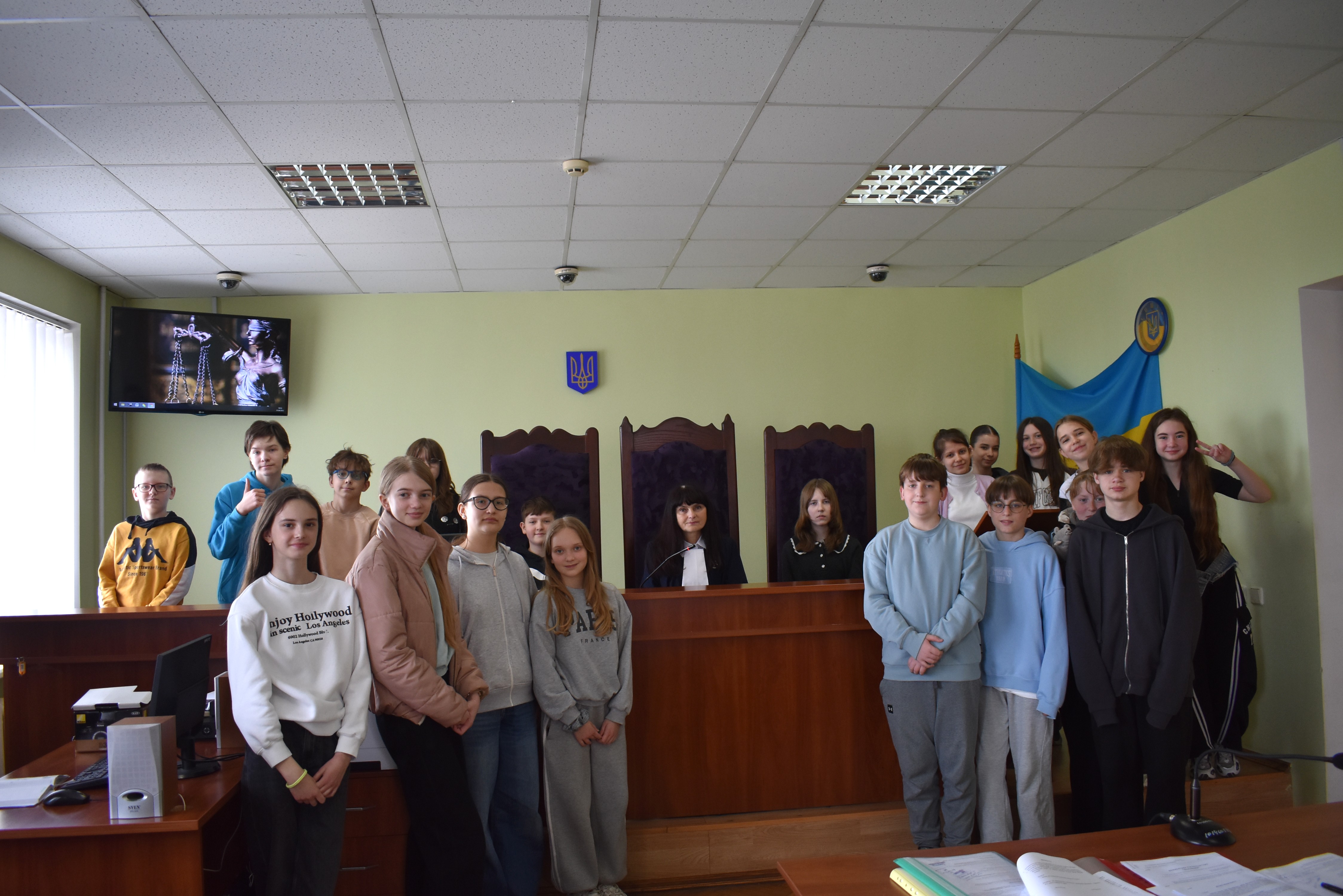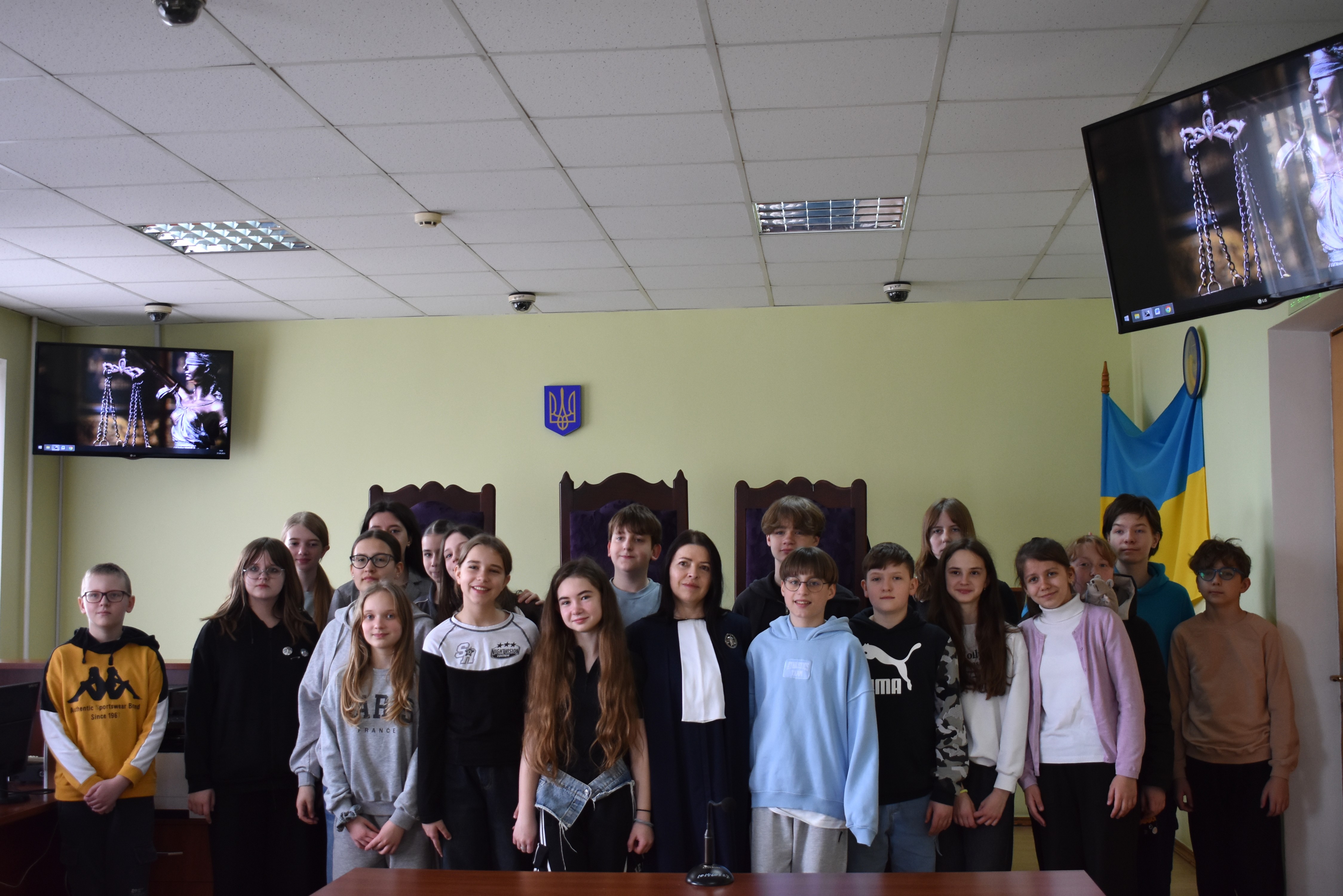Екскурсанти у якості слухачів відвідали судове засідання під головуванням судді Оксани МАШЕВСЬКОЇ за участю секретаря судового засідання Євгенії ГАЗАРОВОЇ. Загалом мали можливість зрозуміти сутність судового процесу, адже справа перебувала та етапі дослідження доказів та судових дебатів.