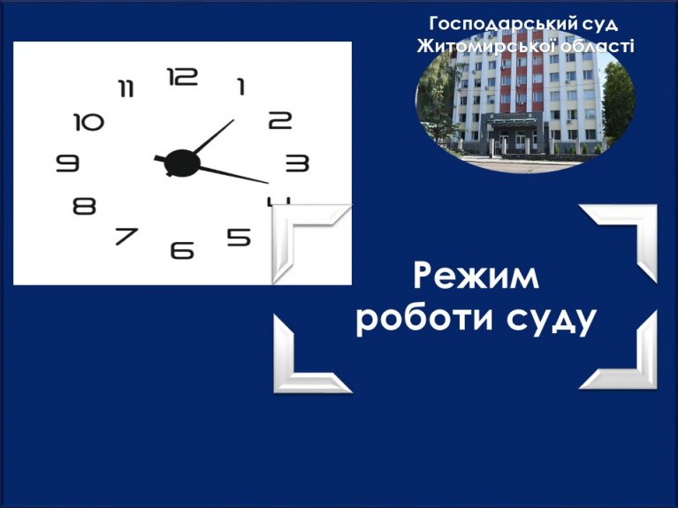 Відповідно до Правил внутрішнього трудового розпорядку Господарського суду Житомирської області від 24 грудня 2025 року, затверджено наступний режим роботи суду: